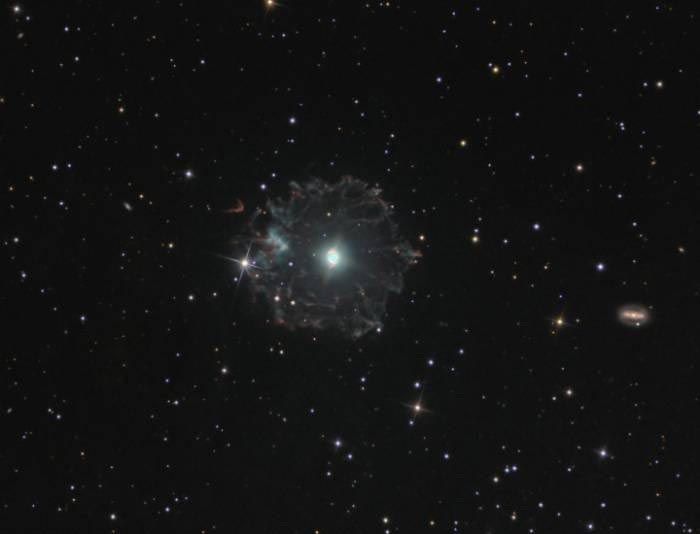 سحابی چشم گربه (NGC6543) یکی از زیباترین سحابی های سیاره نما در آسمان شب است. در مرکز بخش اصلی سحابی به روشنی ثبت شده است. همچنین گازهای اطراف آن با نوردهی های بلند و کوتاه مدت و ترکیب آنها قبل رویت شده اند. سحابی های سیاره نما آخرین فاز عمر یک ستاره مانند خوشید ما هستند. فاصله این سحابی از ما ۳۰۰۰ سال نوری است. تشکیل گازهای شبح گونه در اطراف این سحابی به علت آن است که ستاره مادر در پایان عمر خود گازهای اطراف خود را از دست می دهد که آنها به اطراف پخش می شوند و در نهایت ستاره مادر به صورت کوتوله ای سفید باقی می ماند. این فرآیند حدود ۱۰۰۰۰ سال به طول می انجامد و اخترشناسان تخمین می زنند که تشکیل چنین حلقه ای رشته ای و شبح گون در اطراف٬ حدود ۵۰ تا ۹۰ هزار سال طول خواهد کشید. همچنین در سمت راست این سحابی می توانید کهکشانی مارپیچی با نام NGC6552 را مشاهده کنید که ۵۰ میلیون سال نوری آن سو تر از سحابی چشم گربه قرار دارد.